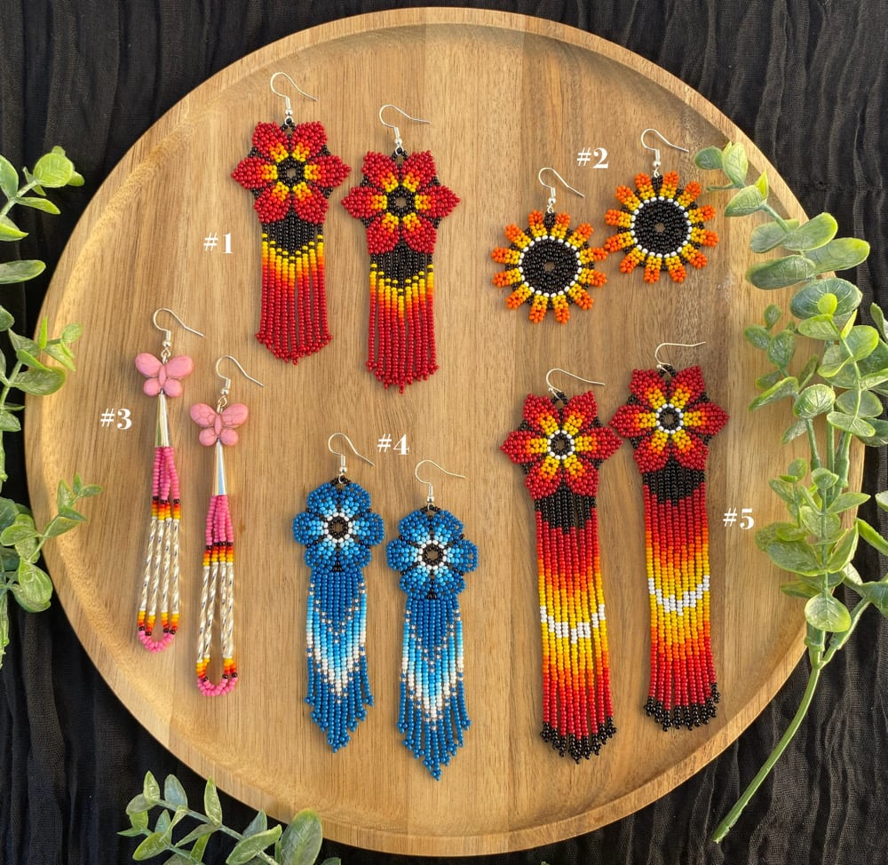 Hand beaded unique earrings made with the hightest intentions! More details: #1: 3.5 in long #2: 1.5 in long #3: 4.5 in long #4: 4 in long #5: 5.5 in long