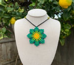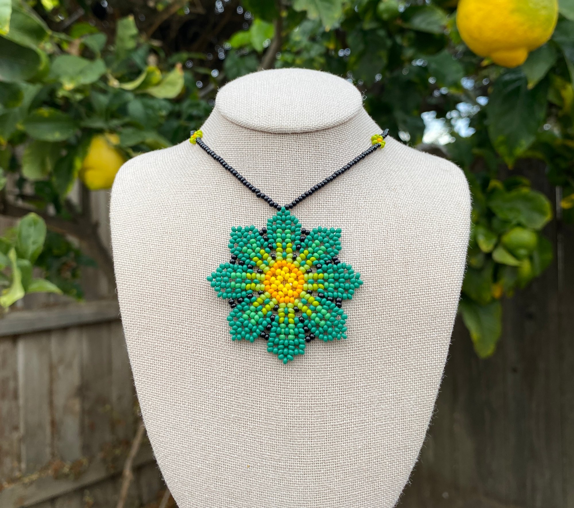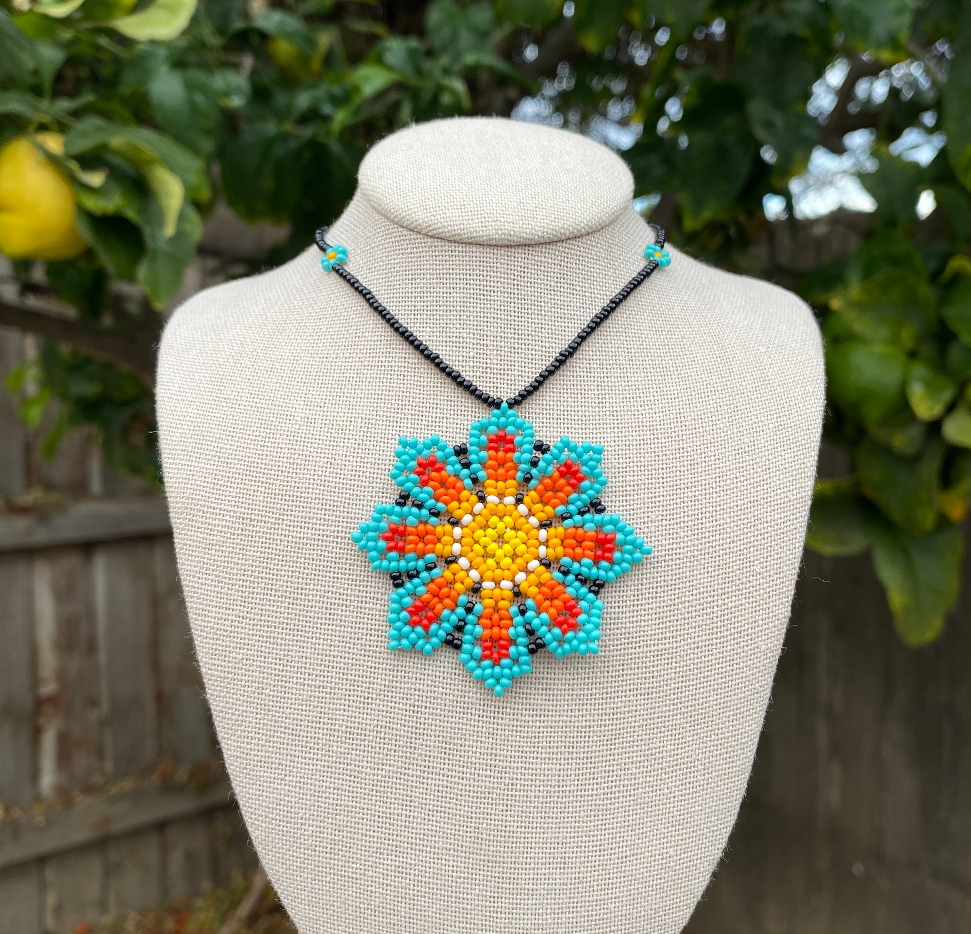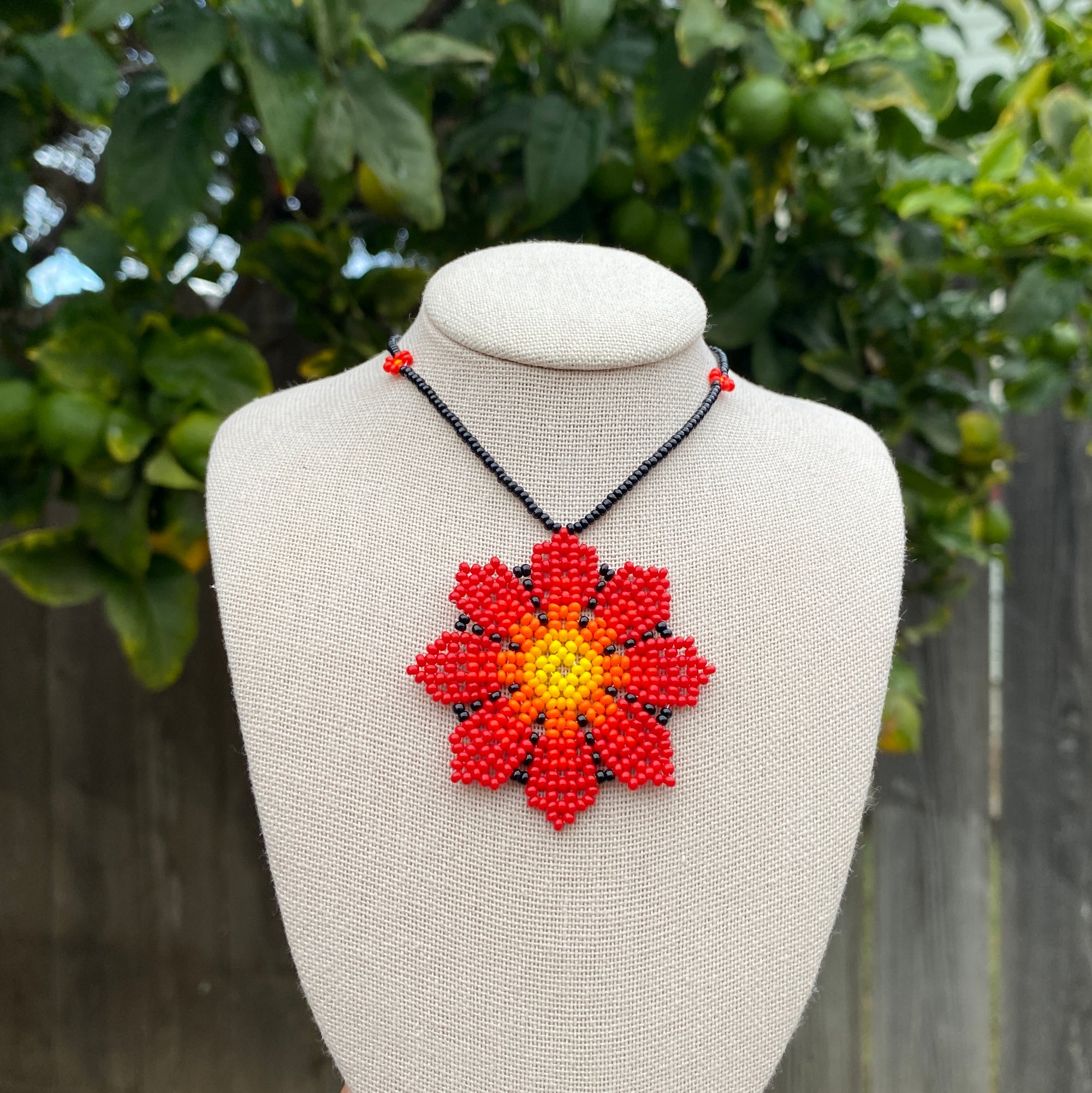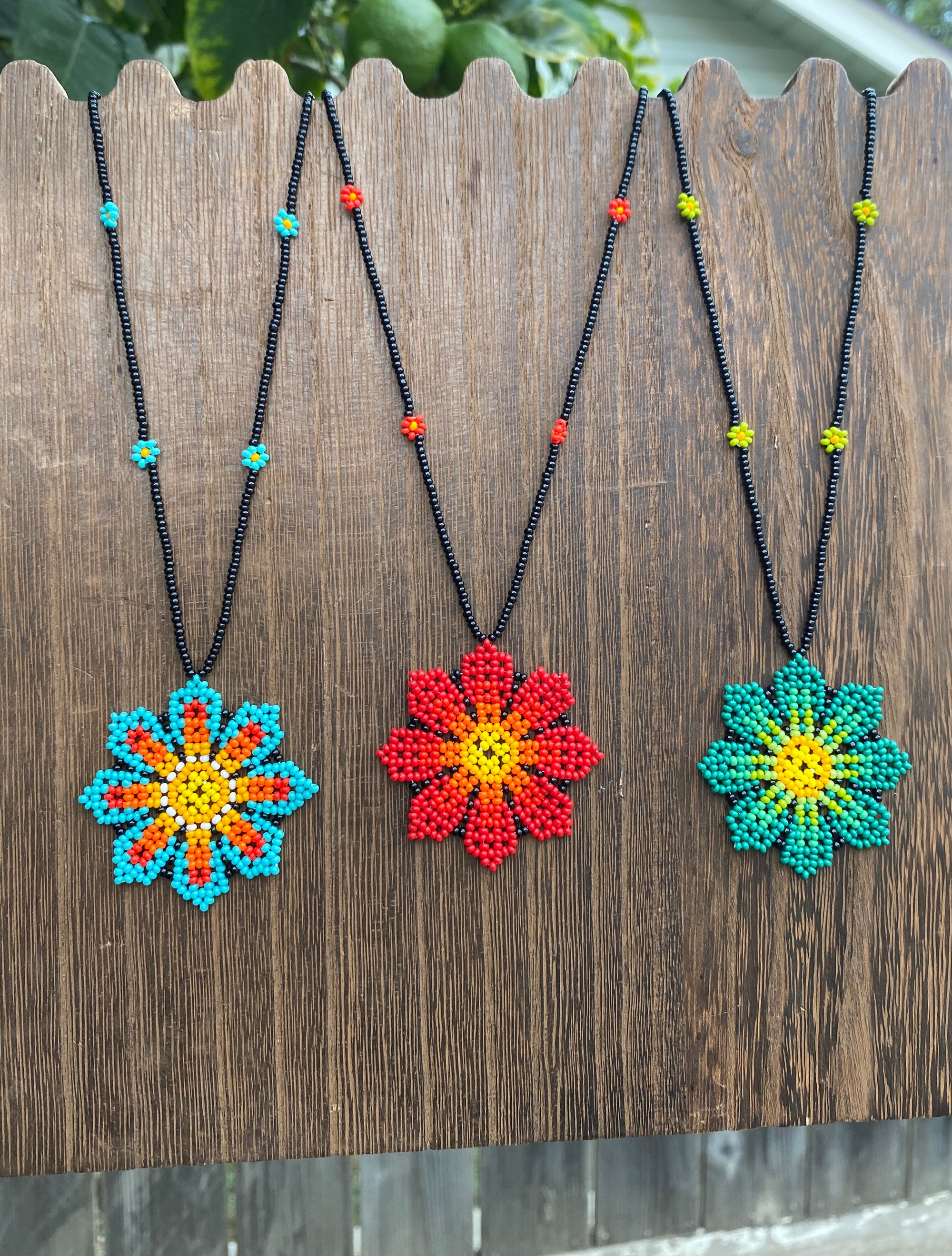 These 24in long beaded necklaces have small flowers on the beaded cord and a medium sized flower in the center!